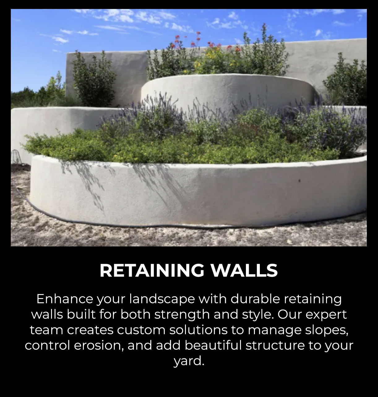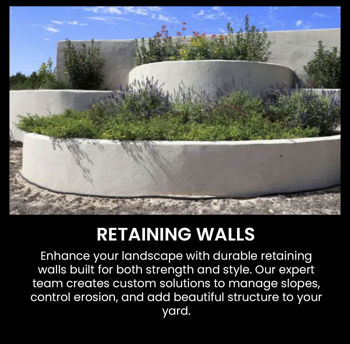 Explore our full range of outdoor solutions designed to enhance the beauty, function, and value of your property. Whether you’re dreaming of a stunning landscape, a strong retaining wall, or a complete outdoor transformation, our experienced team delivers results that last. See how we can bring your vision to life.